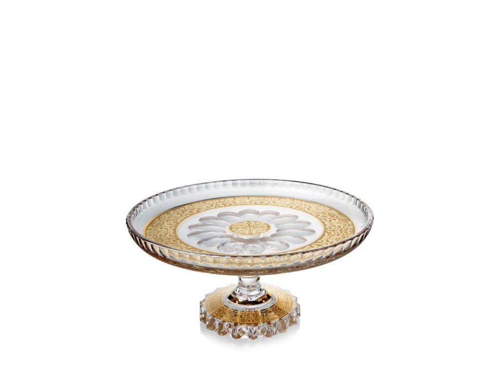 Bohemia Crystal Ručně broušený dortový talíř Romantic na noze 305mm zatíraný zlatem. Vyrobeno z olovnatého křišťálu. Baleno v dárkové krabičce se saténem. Nelze mýt v myčce!
