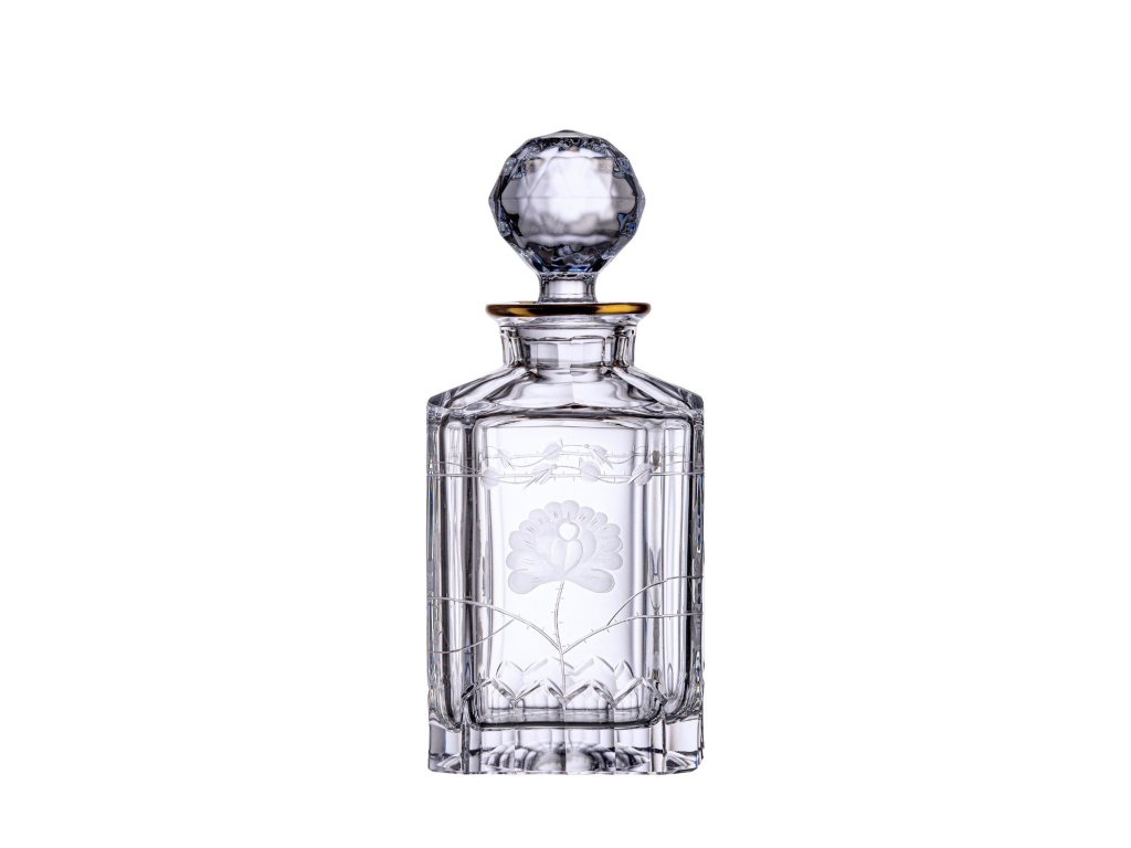 The whisky and rum decanter with floral decoration is a luxurious piece of the most beautiful and purest Czech glass art. Completely handmade. The brilliant and rich cut is perfectly complemented by an elaborate hand-painted decoration made of genuine brushed gold. The decanter looks splendid and noble. Never wash this fantastic decanter in the dishwasher. It needs your personal care to stay beautiful forever.