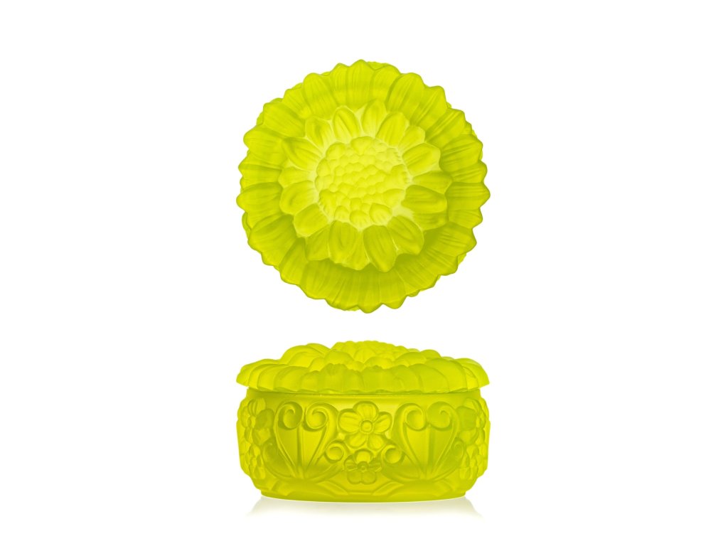 Bohemia Crystal Handmade jar with lid Sunflower. Color Uranium. Made of lead-free uranium crystal. Packed in a dark blue gift box with satin.