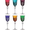 Sada ručně vyráběných, broušených barevných sklenic na víno. V sadě 6 různých barev. Objem 240 ml. Vyrobeno z olovnatého křišťálu. Baleno v dárkové krabici. Nelze mýt v myčce.