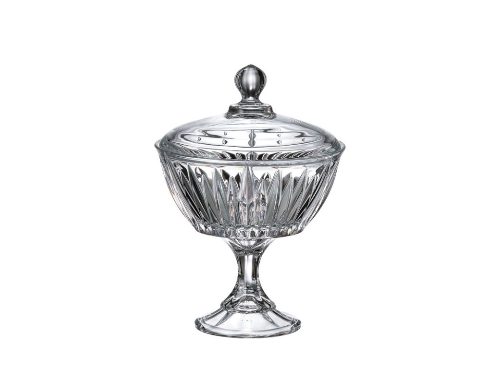 Słoik Bohemia Crystal z pokrywką z kolekcji Nova Venus ma elegancki wygląd z wycięciem strumieniowym na całym obwodzie. Wygląda elegancko i doskonale uzupełnia każde wnętrze. Posiada płaskie dno. Wieczko jest gładkie, zakończone idealnie zmieloną łodygą. Słoik stoi na smukłej nóżce, co nadaje mu nuty kruchości i delikatności. Dzięki średnicy 175 mm nadaje się do przechowywania drobnych przedmiotów, spinaczy, orzechów, cukierków... Twoja wyobraźnia nie ma granic. Może służyć również jako szkatułka na biżuterię lub cukiernica. Jest piękna nawet wtedy, gdy jest pusta, wystarczy postawić ją tam, gdzie świeci słońce i już można cieszyć się spektaklem gry kryształu i światła. Wykonane z litego kryształu bezołowiowego. Nadaje się do zmywarki. Piękny, wysokiej jakości prezent wykonany w Czechach.