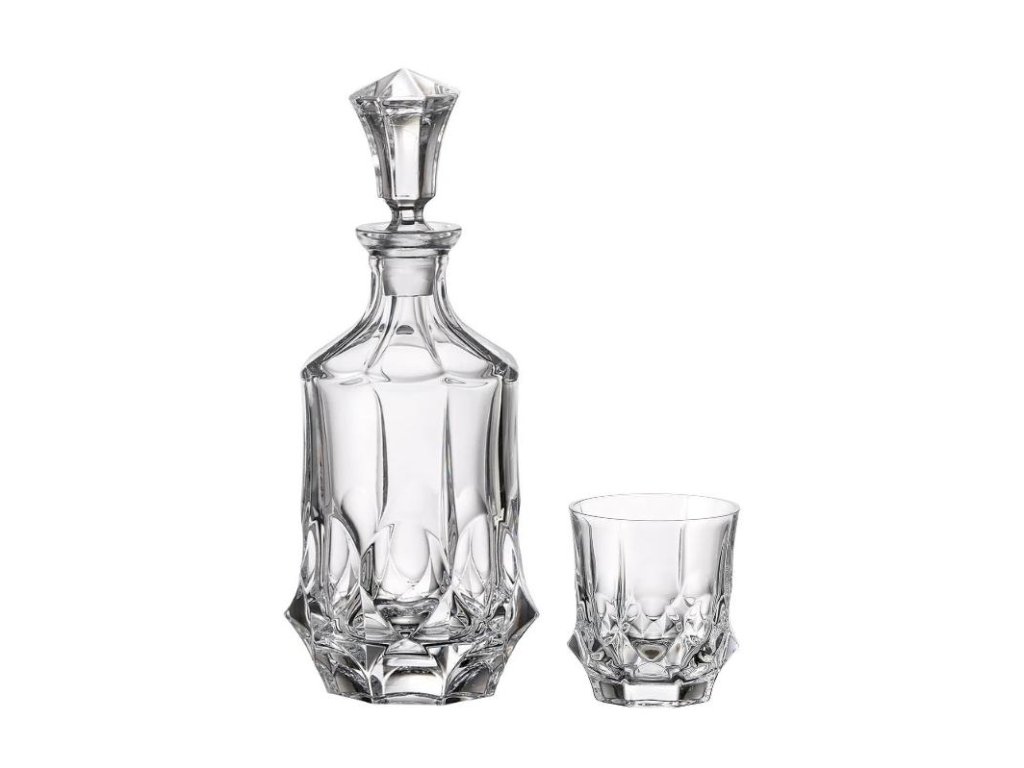 Bohemia Crystal whisky set z kolekcie Soho je napoly hladký, napoly ostro rezaný ako diamanty. Set má moderný dizajn a svojím zaujímavým vzhľadom rozžiaria každý interiér. Bude robiť radosť každému, kto sa na neho pozrie. Naplňte karafu svoju obľúbenú whisky, pálenkou, alebo rumom a vychutnávajte si ich pri chvíľach pohody z dokonalých pohárov. Vďaka tesne priliehavé stopke počká všetka vôňa len a len na vás. Vhodné ako darček pre všetkých milovníkov výborné whisky a kvalitného skla. Vyrobené z olovnatého krištáľu s bezkonkurenčným leskom a pevnosťou. Vhodné do umývačky. Prekrásny luxusný darček českej výroby. Ďalšie kúsky z kolekcie Soho nájdete tu.